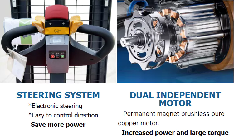 De volledig elektrische stapelaar van BaiYi gebruikt een oplaadbare batterij of AC-motor om het hydraulische systeem aan te drijven om de lading te heffen. De operator gebruikt de bedieningshendel om de palletstapelaar te verplaatsen en de lading op te tillen. Dit maakt het een onmisbaar onderdeel van materiaaltransporttaken waarbij regelmatig zware voorwerpen moeten worden opgetild en verplaatst.