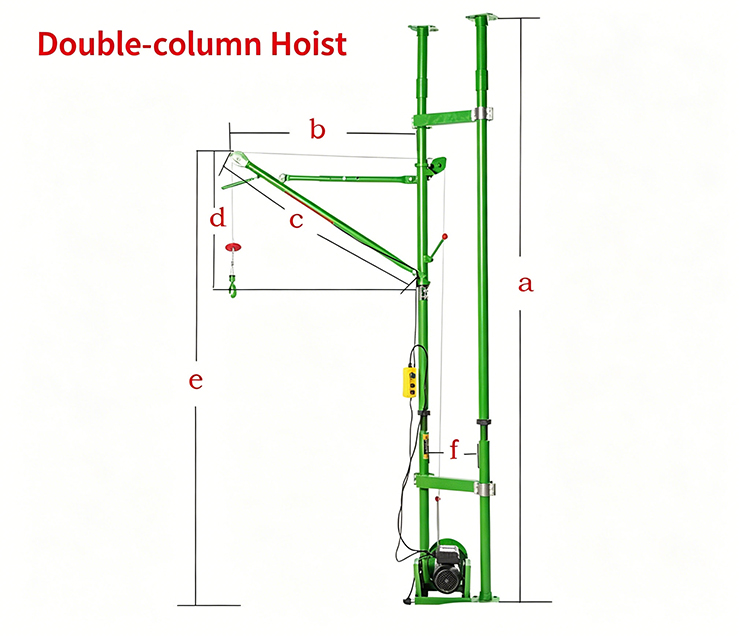 Buitenkranen hebben extra contragewichten nodig (1-2 keer het oorspronkelijke gewicht), ongeacht de locatie. Buitenkranen hebben echter ook hun toepassingen. Binnenkranen worden voornamelijk gebruikt voor hijswerkzaamheden binnenshuis. De twee kolommen kunnen op elk moment in hoogte worden versteld en wanneer de kolommen aan het dak zijn bevestigd, kunnen ze worden vastgezet met topkappen, waardoor er geen extra contragewichten nodig zijn. Dit is een belangrijk voordeel van dubbelkolomskranen.